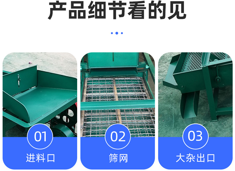 該精選篩為二層篩網(wǎng),先經(jīng)過(guò)進(jìn)料口處風(fēng)機(jī)抽風(fēng),直接抽走重量輕的雜葉或麥秸稈,上層篩的初次篩分再把大雜清理過(guò),好的糧食(種子)直接落到下層篩網(wǎng)上,下層篩網(wǎng)會(huì)把糧食(種子)中的小雜.小石子.有缺陷的糧食(種子)直接漏掉,完好的糧食(種子)會(huì)從出料口篩分出來(lái)。該小型清糧機(jī)解決了揚(yáng)場(chǎng)機(jī)的功能單一,不能有效去除石子.土塊的缺陷,更能為清理、凈選糧食(種子)帶來(lái)滿意的效果。該機(jī)有占地小,移動(dòng)方便,便以維修,除塵除雜效率明顯,能耗低,使用簡(jiǎn)便等優(yōu)點(diǎn)。真可謂是中小型糧食清理凈選篩中的戰(zhàn)斗機(jī)!
