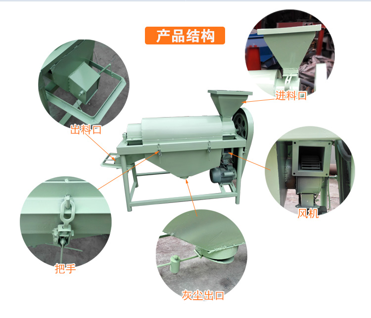 進料口里面有一個調節(jié)擋板可以調節(jié)物料進入多少。出料口為了配合裝袋我們上面有袋子的掛鉤,當然出料口可以根據(jù)您的實際情況進行定做,風機就是將水稻芒還有灰塵等輕小物料直接吹出來,電機我們采用的是全銅線圈電機,耐用,質量好。
