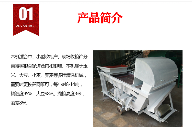 糧食精選機(jī)常用于小麥、水稻、玉米、大豆、棉種及各種油料種子的精選、分級和除雜。適合廣大種糧收糧大戶和飼料加工廠使用。該機(jī)篩選大豆和玉米每小時(shí)3-5噸,篩選小麥和水稻每小時(shí)2-3噸,篩選棉種和油料種子每小時(shí)500-1000公斤。對糧食和油料里面的灰塵、碎屑、壞糧及小石子等雜質(zhì),篩分率達(dá)到95%以上。該精選機(jī)可選用380V-3kw電機(jī)做動力源,集風(fēng)選和篩分為一體,能干凈地清理糧食或油料種子里面的各種雜質(zhì)和塵土。