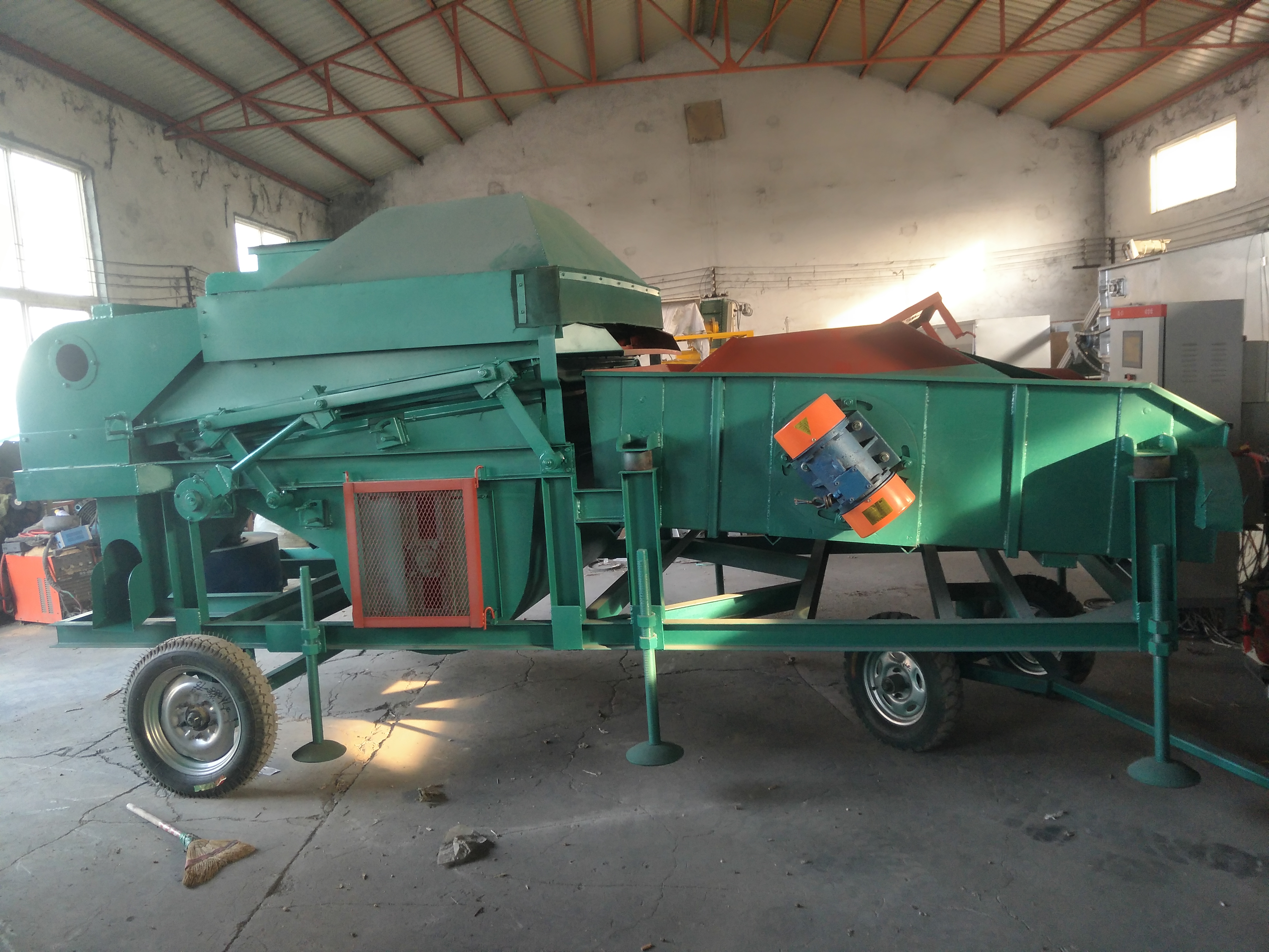 本機(jī)由機(jī)架及運(yùn)輸輪,傳動部分,主風(fēng)機(jī)、重力分離臺、吸風(fēng)機(jī)、吸風(fēng)道、篩箱等組成,移動靈活,更換篩板方便、性能良好等特點。